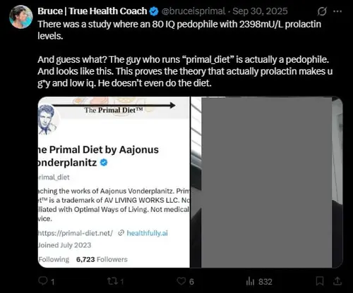 Bruce also made a post accusing me of being a pedophile, because I exposed his scam and his lies when he came into my @primaldiet group on Telegram to shill himself.