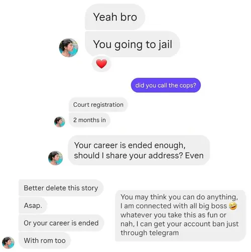 Bruce pretends he called the police, threatens with jail time, with address doxing, with account banning, and so on, because of his scam being revealed: