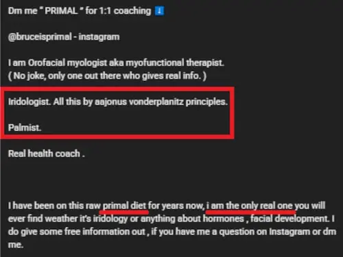 Besides his name being "bruce is primal", his description says "by Aajonus principles", "THE ONLY REAL ONE". And he comes to Primal Diet groups to shill himself and insult people who question his lies, really a virulent scammer.